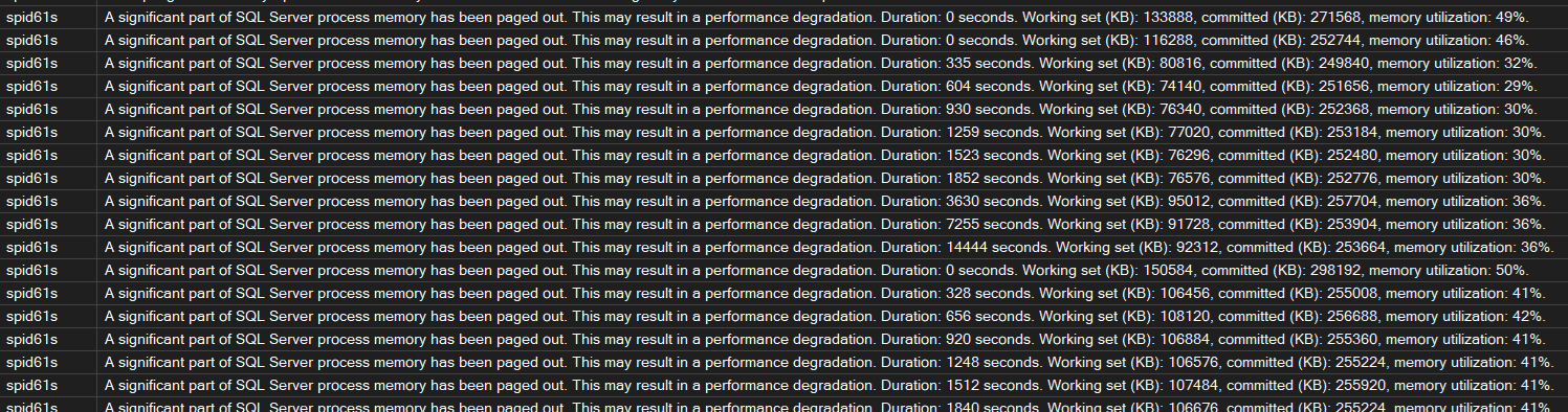 Look for “insufficient memory” or “A significant part of sql server process memory has been paged out”. That second one is serious — the OS has started paging SQL Server memory to disk.